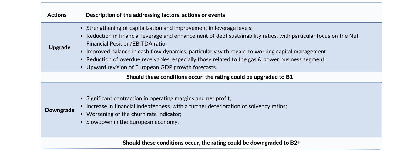 In the following table, the addressing factors, actions or events that could lead to an upgrade or a downgrade are summarized: