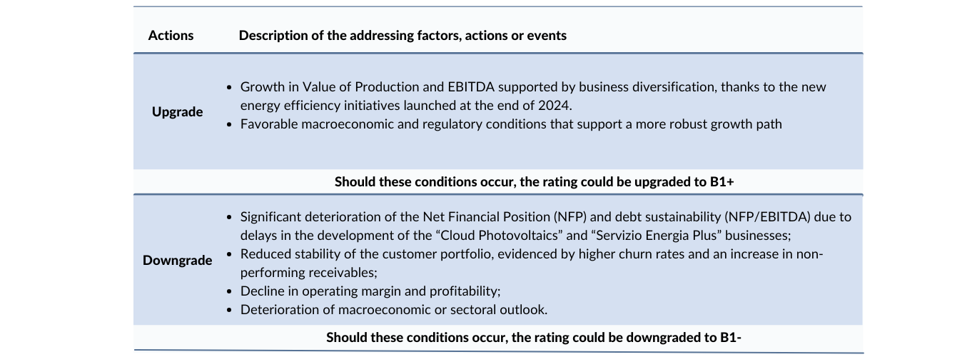 In the following table, the addressing factors, actions or events that could lead to an upgrade or a downgrade are summarized: