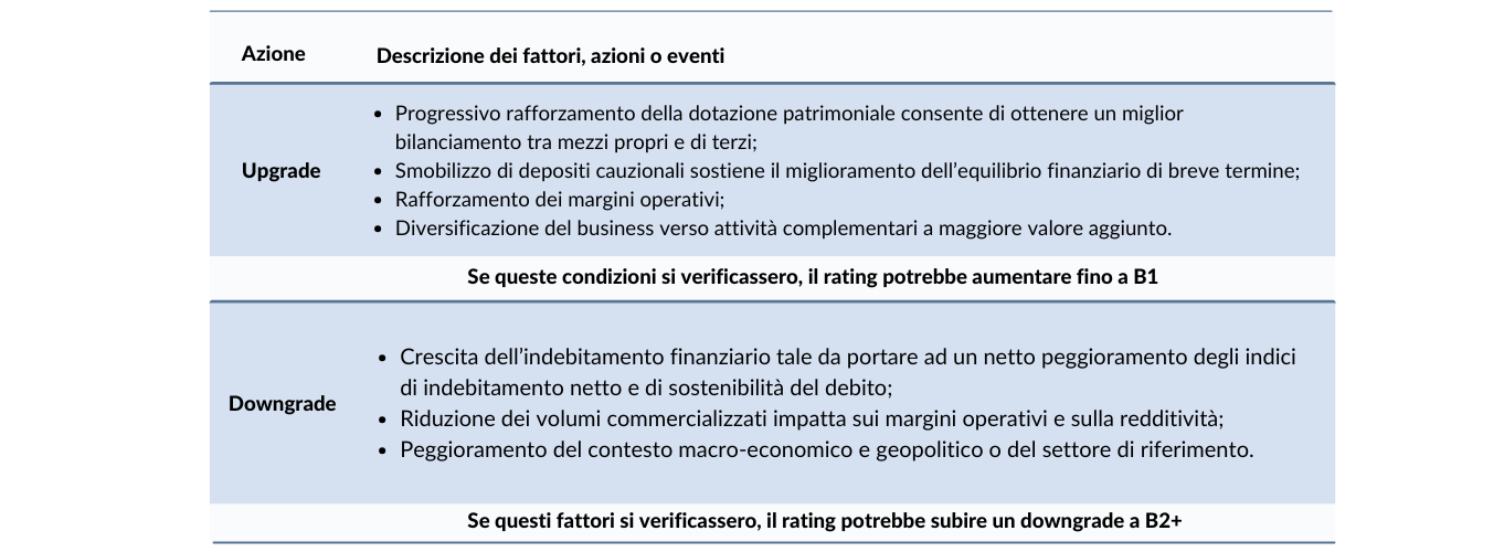 Nella tabella seguente vengono riportati i fattori, le azioni o gli eventi che potrebbero portare il giudizio di rating ad un upgrade o ad un downgrade: