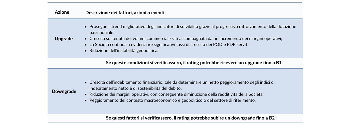 Nella tabella seguente vengono riportati i fattori, le azioni o gli eventi che potrebbero portare il giudizio di rating ad un upgrade o ad un downgrade: