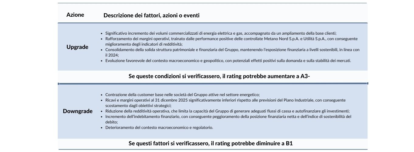 Nella tabella seguente vengono riportati i fattori, le azioni o gli eventi che potrebbero portare il giudizio di rating ad un upgrade o ad un downgrade: