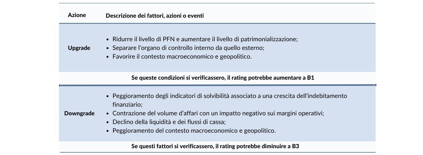 Nella tabella seguente vengono riportati i fattori, le azioni o gli eventi che potrebbero portare il giudizio di rating ad un upgrade o ad un downgrade: