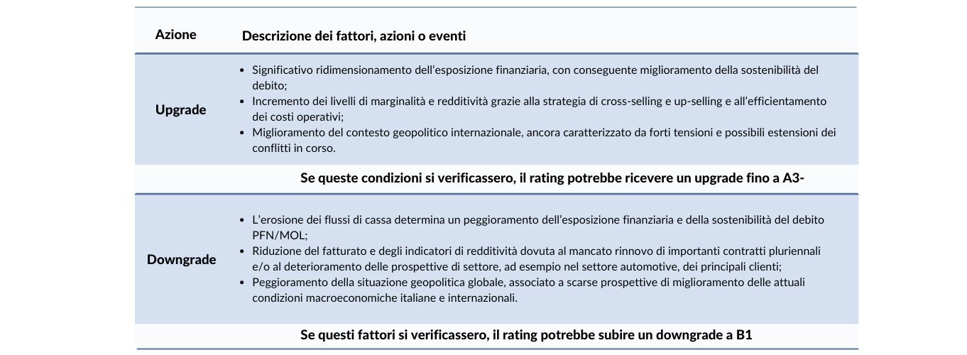 Nella tabella seguente vengono riportati i fattori, le azioni o gli eventi che potrebbero portare il giudizio di rating ad un upgrade o ad un downgrade: