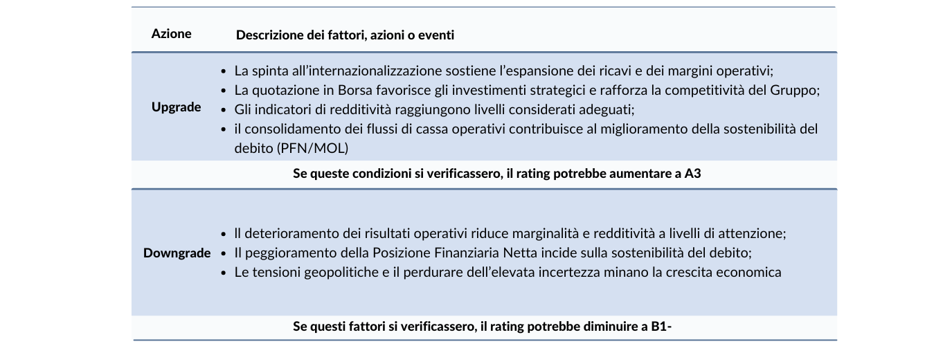 Nella tabella seguente vengono riportati i fattori, le azioni o gli eventi che potrebbero portare il giudizio di rating ad un upgrade o ad un downgrade: