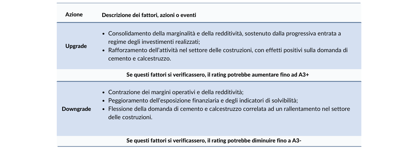 Nella tabella seguente vengono riportati i fattori, le azioni o gli eventi che potrebbero portare il giudizio di rating ad un upgrade o ad un downgrade: