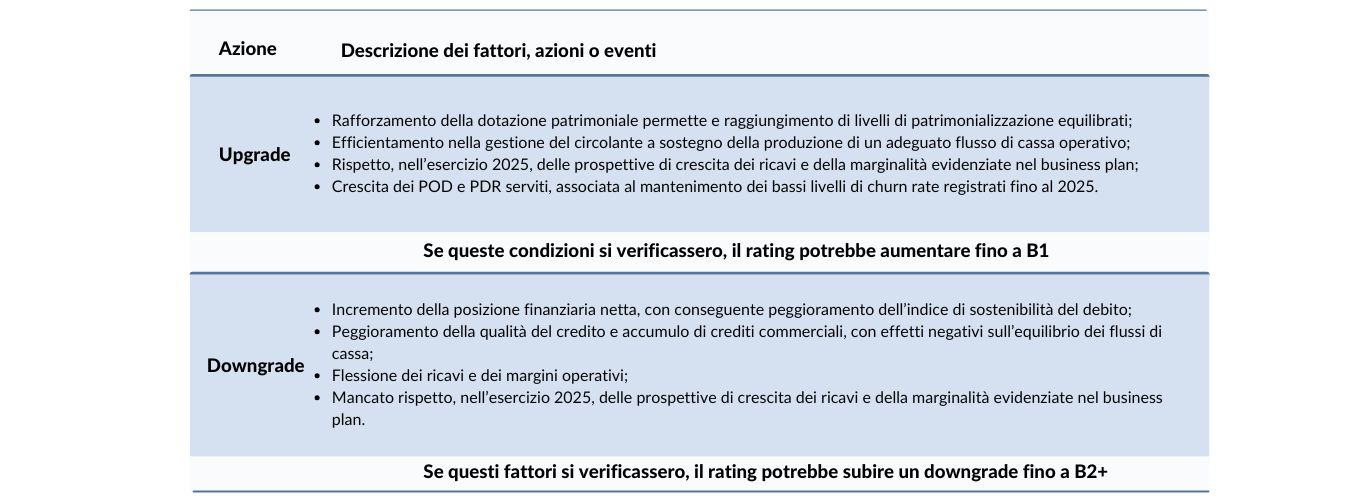 Nella tabella seguente vengono riportati i fattori, le azioni o gli eventi che potrebbero portare il giudizio di rating ad un upgrade o ad un downgrade: